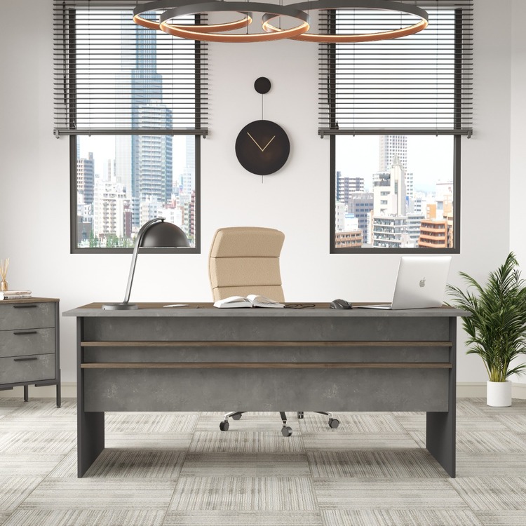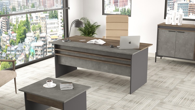 Přinášíme vám nový psací stůl, který se stane centrálním kouskem každé moderny zařízené kanceláře nebo pracovny. S jeho impozantními rozměry a výrazným dekorem betonu, tento stůl nejenže poskytuje komfort a funkčnost, ale také přidává silný estetický prvek do vašeho pracovního prostoru.