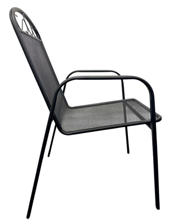 Zahradní kovové křeslo. Díky volbě materiálu je křeslo lehce omyvatelné a jeho údržba není nijak náročná. Rozměry křesla jsou ( Š x V x H cm ) – 57 × 94 × 69 cm. Výška sedu je cca 43 cm. Barevné provedení – černá.
