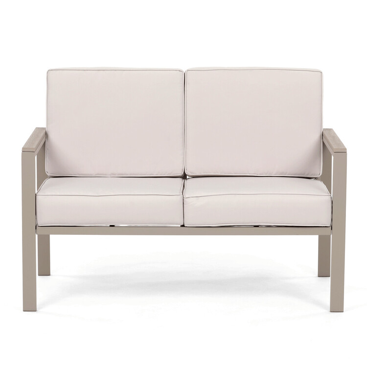 Zahradní sestava v béžovém provedení kombinuje pevný kovový rám s pohodlnými sedáky potaženými odolnou látkou v béžové barvě. Desky stolku i područky jsou vyrobeny z polywoodu, materiálu známého svou vysokou odolností vůči povětrnostním vlivům a snadnou údržbou. Konstrukce sestavy je navržena tak, aby poskytovala stabilitu a komfort při venkovním posezení, přičemž polstrování zajišťuje pohodlné sezení i během delšího užívání. Součástí jsou dvě samostatné křesla a dvoumístná pohovka, které společně s praktickým stolkem vytvářejí ideální prostor pro relaxaci na zahradě či terase. Celkový design je jednoduchý a moderní, vhodný pro různé venkovní prostory.