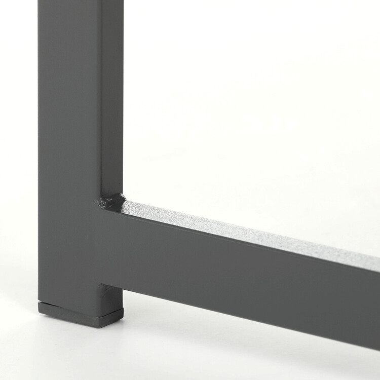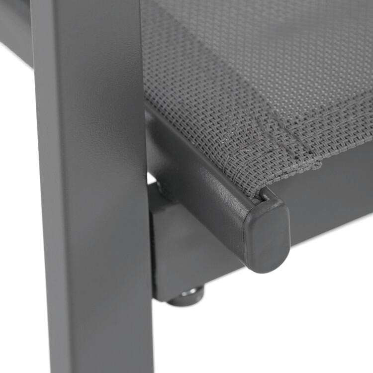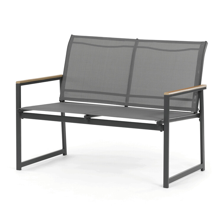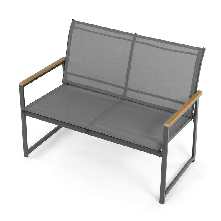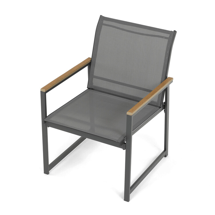 Zahradní set v šedém provedení kombinuje pevný kovový rám s komfortním textilním potahem sedáků a opěradel, které zajišťují pohodlné posezení. Stolová deska je vyrobena z černého tvrzeného skla, které je odolné vůči povětrnostním vlivům a snadno se udržuje. Dřevěné polywoodové doplňky na područkách přidávají přírodní akcent a zároveň zvyšují komfort při opření rukou. Nadčasový design s čistými liniemi se hodí do různých zahradních aranžmá a vytváří příjemné prostředí pro relaxaci i společenská setkání. Stabilní konstrukce zajišťuje bezpečnost a dlouhou životnost celé sestavy.