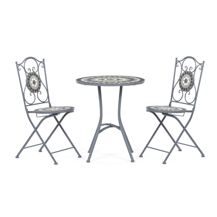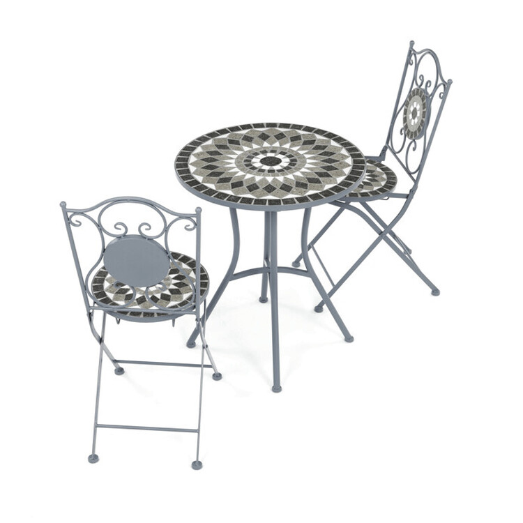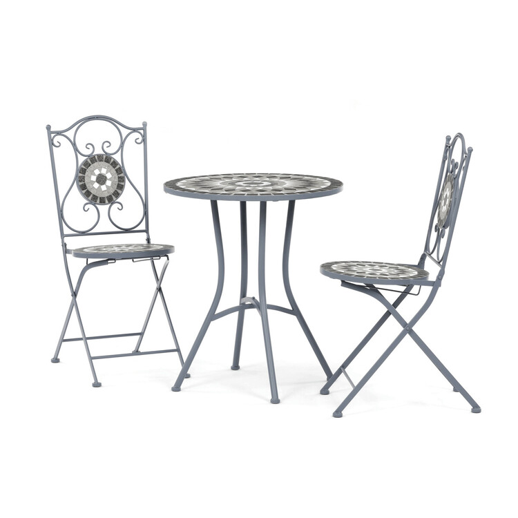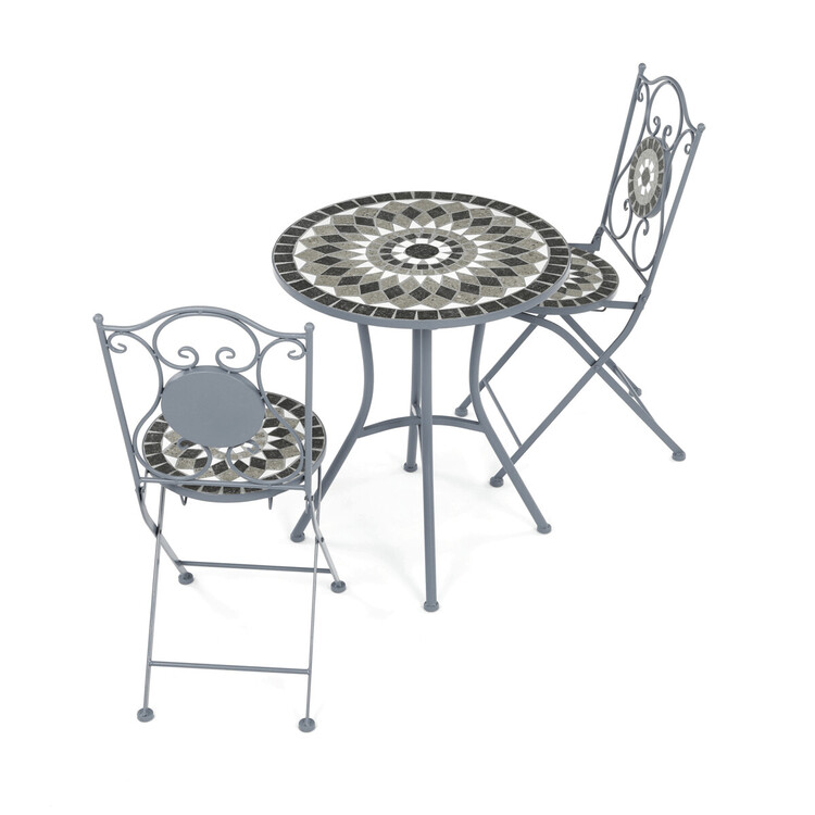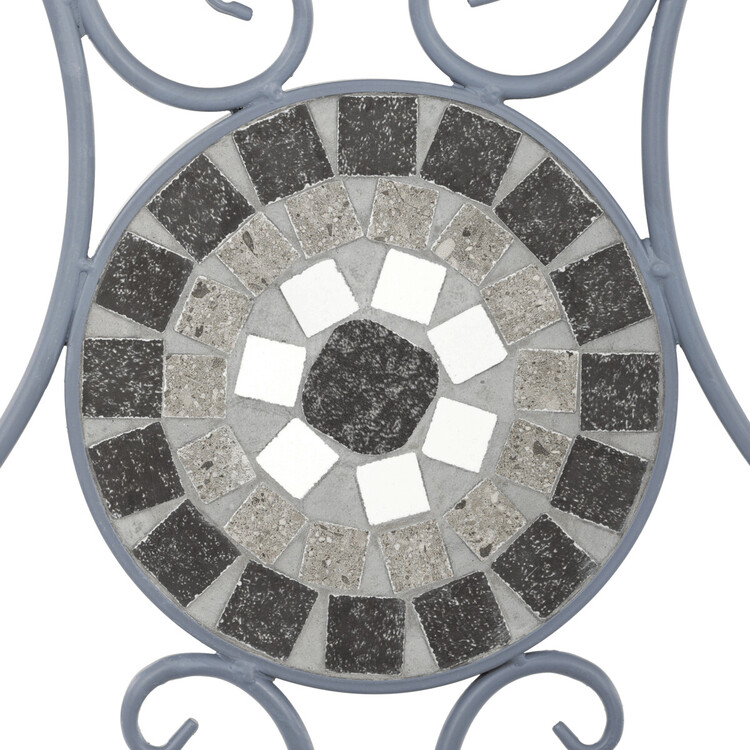 Zahradní set US1500 se skládá z kulatého stolu a dvou židlí, které jsou vybaveny keramickou mozaikou v šedých odstínech, jež vytváří dekorativní a odolný povrch. Pevná kovová konstrukce zajišťuje stabilitu a dlouhou životnost nábytku, zatímco elegantní křivky opěradel židlí dodávají celému... více informací o zboží