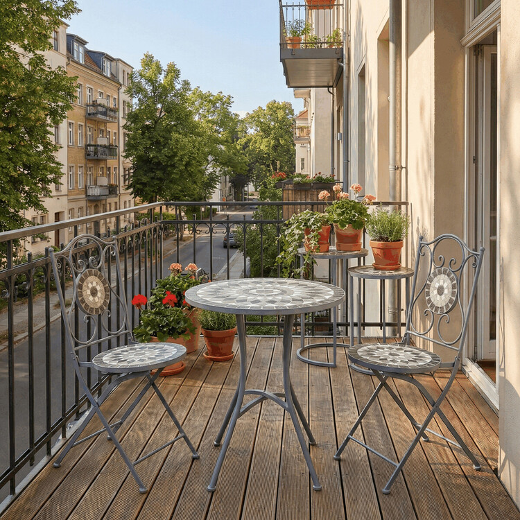 Zahradní set US1500 se skládá z kulatého stolu a dvou židlí, které jsou vybaveny keramickou mozaikou v šedých odstínech, jež vytváří dekorativní a odolný povrch. Pevná kovová konstrukce zajišťuje stabilitu a dlouhou životnost nábytku, zatímco elegantní křivky opěradel židlí dodávají celému setu lehkost a styl. Keramická deska stolu je snadno udržovatelná a odolná vůči povětrnostním vlivům, což činí tento set vhodným pro venkovní použití na balkónech či terasách. Díky kompaktním rozměrům je ideální pro menší venkovní prostory, kde nabízí pohodlné posezení pro dvě osoby.