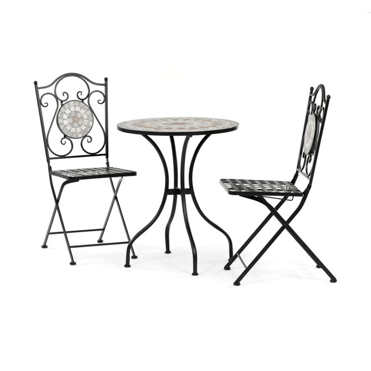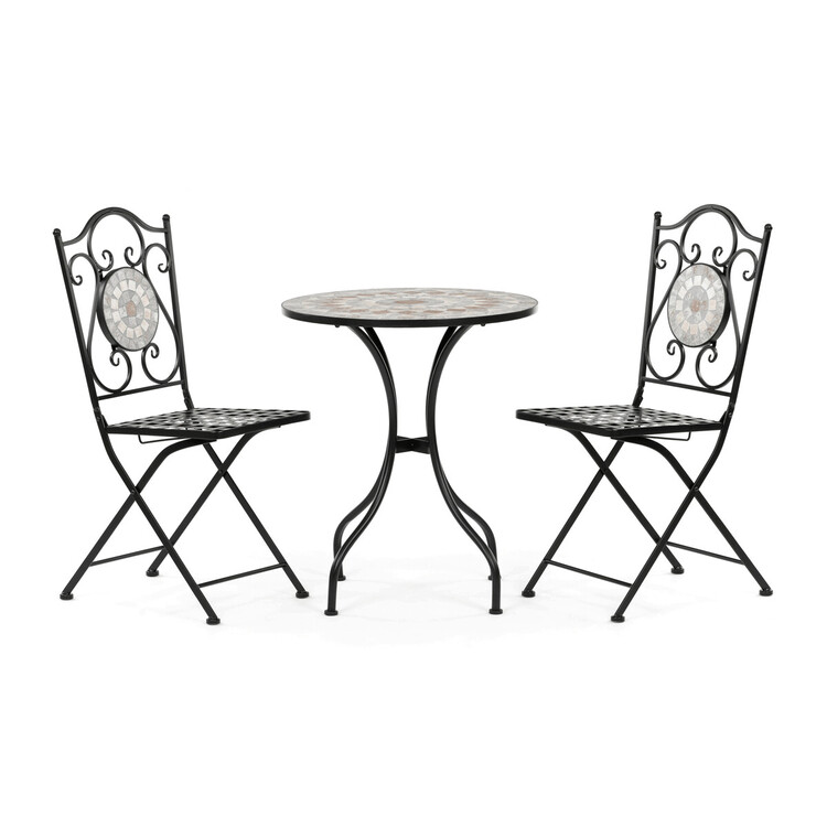 Zahradní set US1400 se skládá z kulatého stolu a dvou židlí s pevnou kovovou konstrukcí v černém provedení. Deska stolu je vyrobena z keramické mozaiky, která kombinuje přírodní odstíny a vytváří dekorativní vzor s dlouhou životností a snadnou údržbou. Židle mají sedáky s mřížkovým vzorem a... více informací o zboží