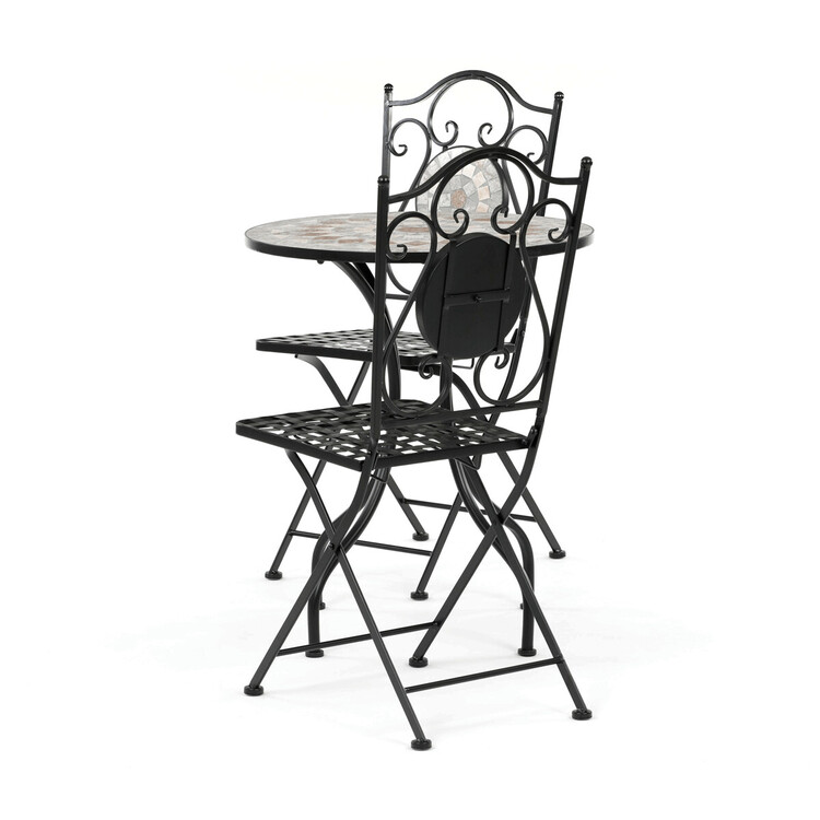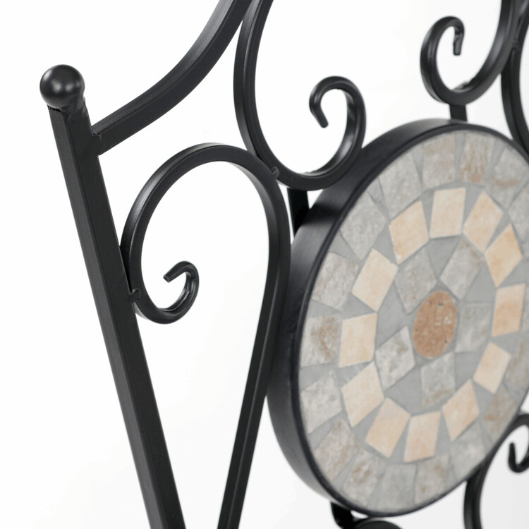 Zahradní set US1400 se skládá z kulatého stolu a dvou židlí s pevnou kovovou konstrukcí v černém provedení. Deska stolu je vyrobena z keramické mozaiky, která kombinuje přírodní odstíny a vytváří dekorativní vzor s dlouhou životností a snadnou údržbou. Židle mají sedáky s mřížkovým vzorem a opěradla zdobí keramické kruhové vložky, které ladí s designem stolu. Stabilní kovová podnož zajišťuje pevnost a odolnost setu, vhodného pro použití na balkónech i zahradách. Kompaktní rozměry umožňují pohodlné usazení dvou osob a přispívají k praktickému využití prostoru.