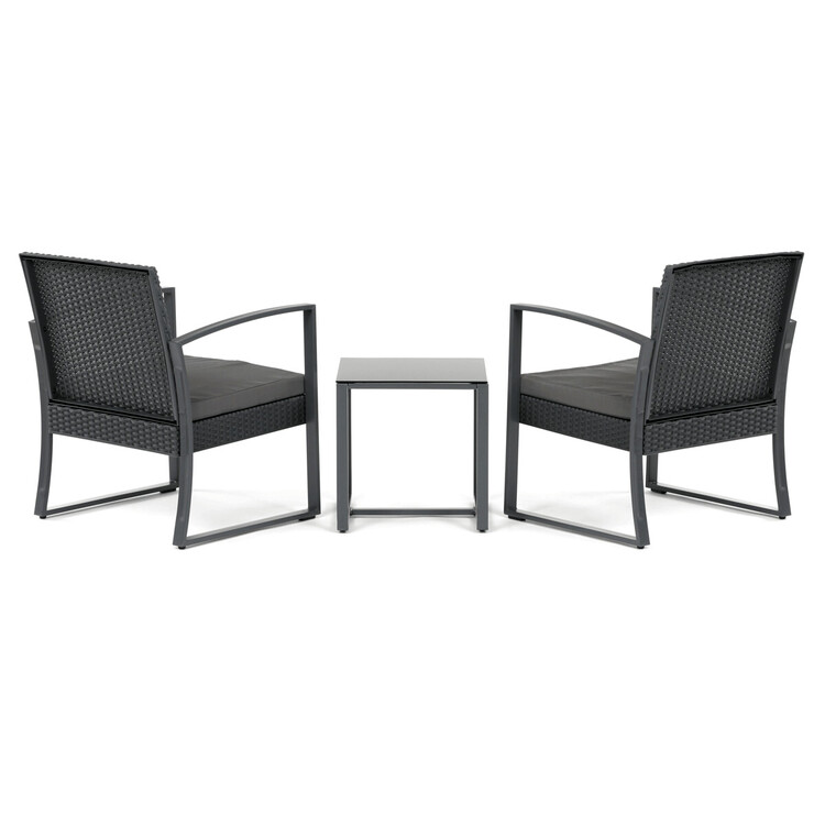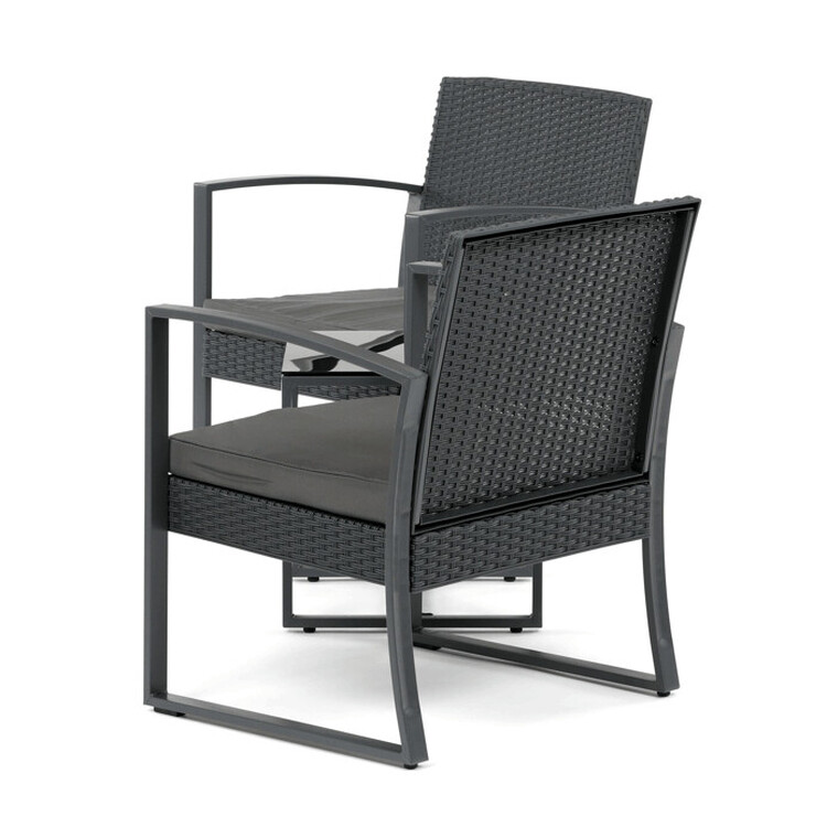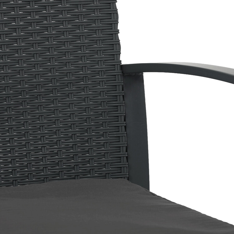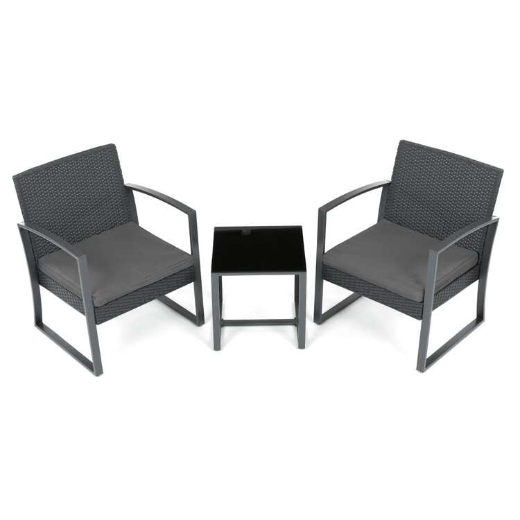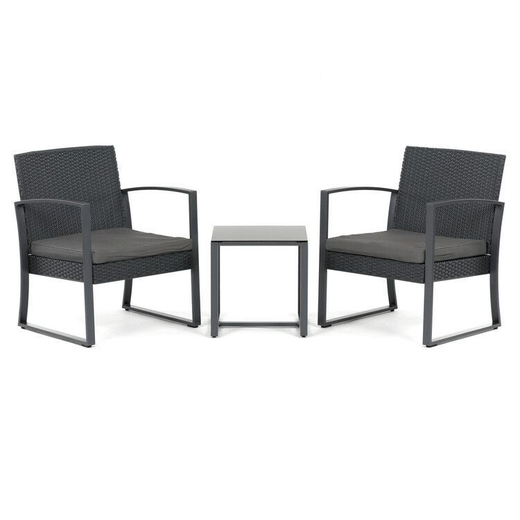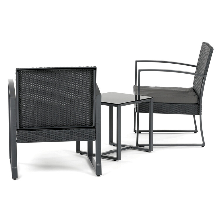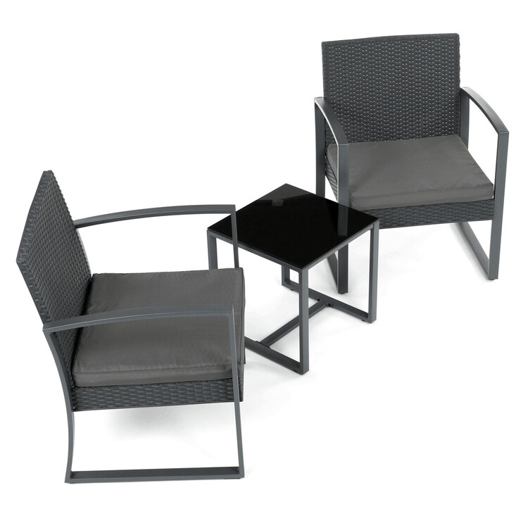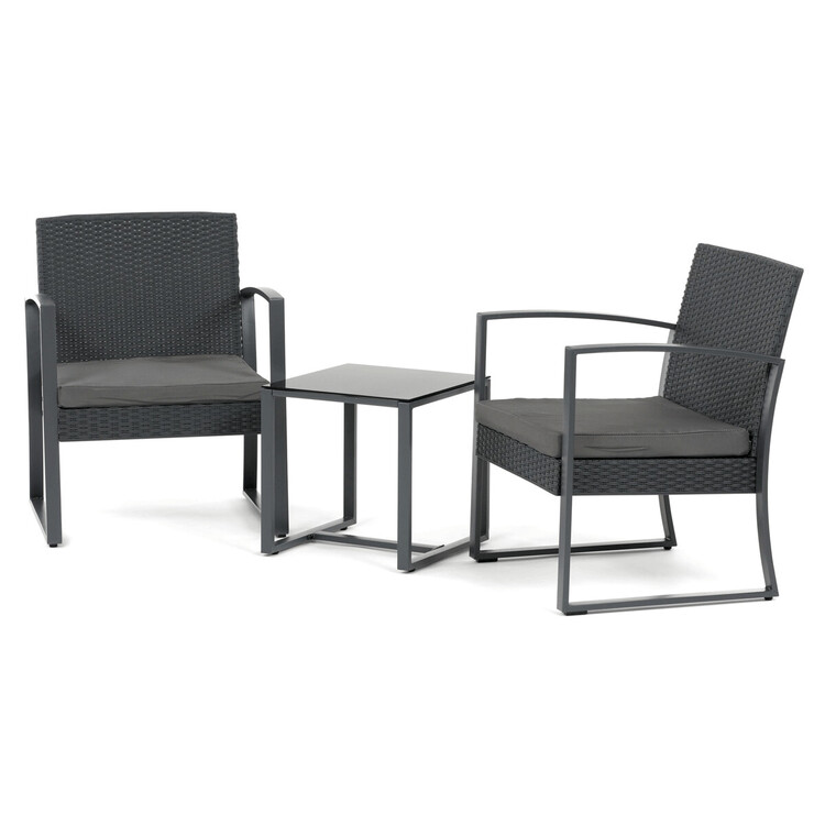 Zahradní set 1+2 v šedém provedení kombinuje pevnou kovovou konstrukci s odolným polyratanem, který je vhodný pro venkovní použití. Součástí jsou dvě pohodlná křesla s polstrovanými sedáky potaženými šedou látkou, která zajišťují komfortní posezení. Stolová deska je vyrobena z černého tvrzeného skla, které je snadno udržovatelné a dodává celému setu moderní vzhled. Stabilní rám z kovu zaručuje dlouhou životnost a bezpečnost při užívání. Díky kompaktním rozměrům je set ideální pro balkóny, terasy či menší zahrady.