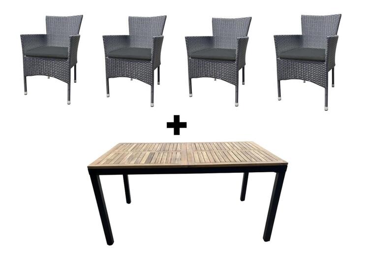 Stylová zahradní sestava se skvěle hodí na balkon, terasu i zahradu. Deska stolu je vyrobena z kvalitního masivního dřeva akácie. Přírodní dřevěný dekor vrchní desky v kombinaci s černou kovovou konstrukcí tvoří výjimečný designový prvek vaší zahrady nebo terasy. Díky poctivému materiálu je stůl mimořádně odolný. Konstrukce křesel je vyrobena z kovu, barevné provedení umělého ratanu je černý antracit. Použití hliníkové konstrukce pro zahradní nábytek, který musí odolávat zvýšené vlhkosti, je tou správnou volbou. Hliník je lehký a nerezaví – s takovou konstrukcí tedy budete bez starostí. Čalouněné sedáky křesel v antracitové barvě jsou snímatelné, pratelné a mají výšku 3 cm. Rozměry křesla (v/š/h): 87 × 67 × 52 cm. Výška sedu: 42 cm, šířka sedu: 46 cm. Rozměry stolu (š/v/h): 150 × 74 × 90 cm. Dodáváme v demontovaném stavu.Péče o zahradní nábytek z masivu:Používejte ubrus a podložky, abyste předešli vzniku skvrn. Nepoužívejte abrazivní prostředky jako aceton, bělidlo, rozpouštědla apod. Ostré předměty mohou poškodit povrch. Čistěte vlhkým hadříkem namočeným v jemném mýdlovém roztoku a ihned osušte suchým hadříkem. Mimo sezónu skladujte na suchém krytém místě. Pokud jej necháte venku, chraňte jej na podzim, v zimě a během dešťů nepromokavým krytem.CASA 95245 + 96002