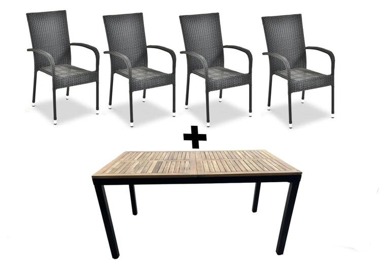 Stylová zahradní sestava se skvěle hodí na balkon, terasu i do zahrady. Deska stolu je vyrobena z kvalitního masivního dřeva akácie. Přírodní dřevěný dekor vrchní desky v kombinaci s černou kovovou konstrukcí tvoří výjimečný designový prvek vaší zahrady či terasy. Díky pečlivému zpracování a použití poctivých materiálů je stůl mimořádně odolný. Konstrukce křesel je vyrobena z kovu, barevné provedení umělého ratanu je antracit. Hliníková konstrukce je lehká, odolná a nerezaví, takže je ideální volbou pro venkovní použití. Výhodou je, že křesla jsou stohovatelná, a tedy snadno uskladnitelná. Rozměry křesla (v/š/h): 94 × 56 × 64 cm, výška sedu: 43 cm, šířka sedu: 46 cm. Rozměry stolu (š/v/h): 150 × 74 × 90 cm. Dodáváme v demontovaném stavu.
