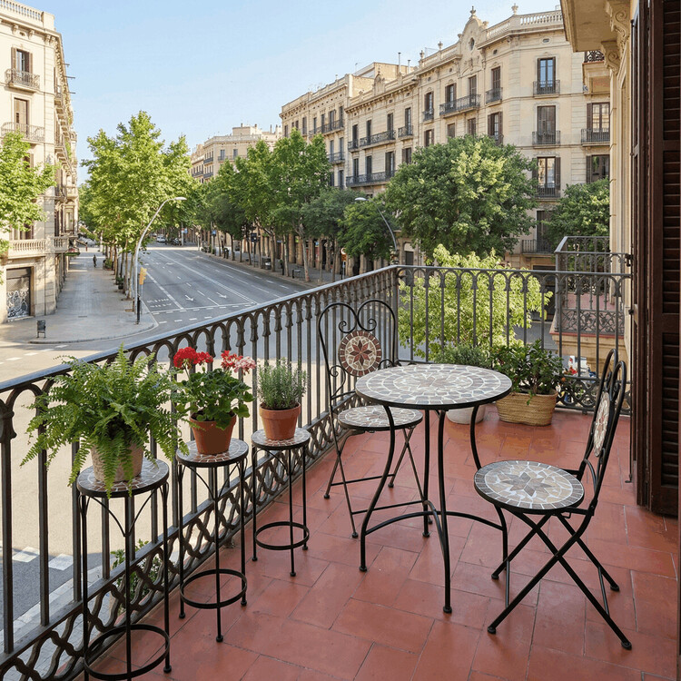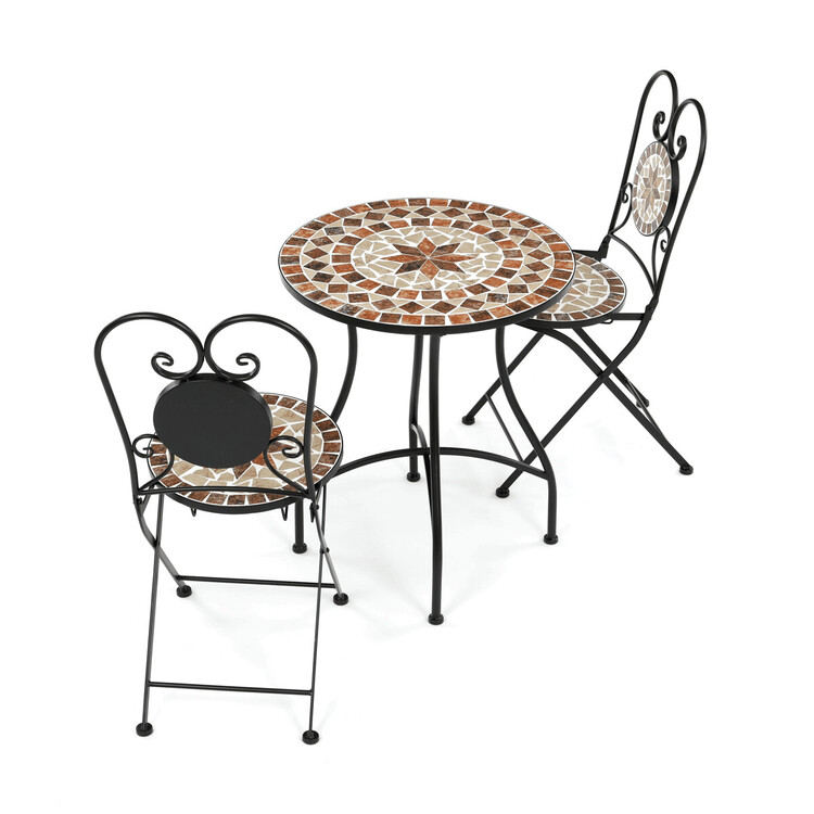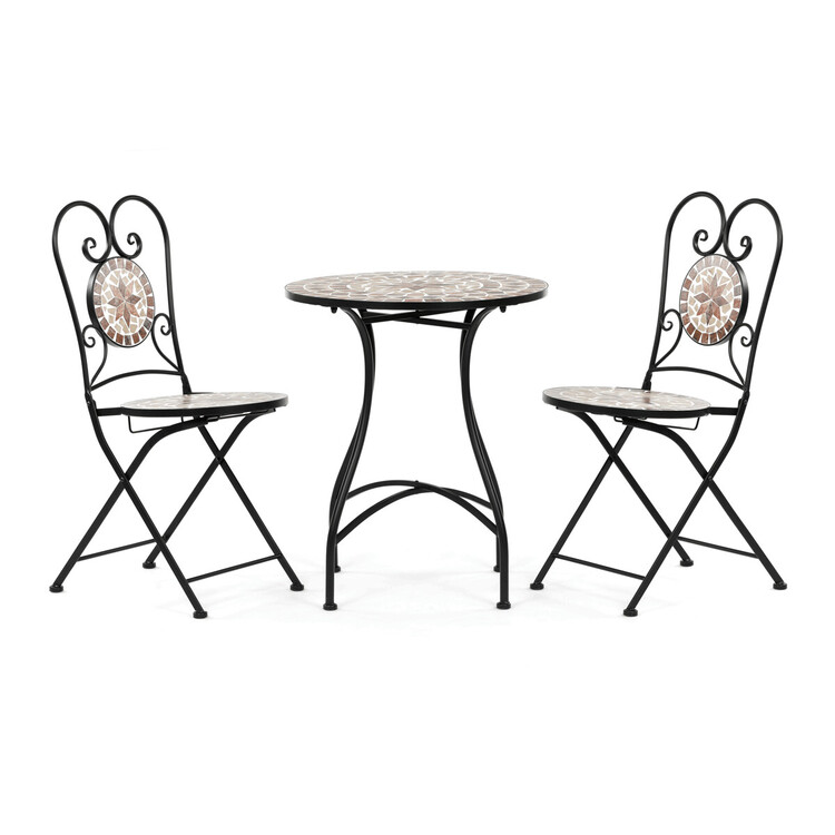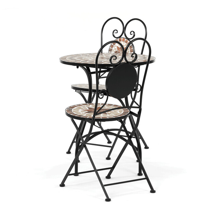 Zahradní set sestávající z kulatého stolu a dvou židlí kombinuje pevnou kovovou konstrukci s dekorativní keramickou mozaikou na deskách. Kovové nohy stolu i židlí jsou tvarované do elegantních oblouků a zdobeny jemnými kovanými detaily, které dodávají celku lehkost a stabilitu. Keramická mozaika v přírodních a teplých odstínech vytváří výrazný vizuální efekt a zároveň je snadno udržovatelná. Set je vhodný pro venkovní použití na balkónech či terasách, kde poskytuje pohodlné posezení pro dvě osoby. Díky kombinaci materiálů je navržen pro dlouhou životnost a odolnost vůči povětrnostním vlivům.