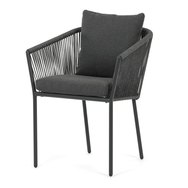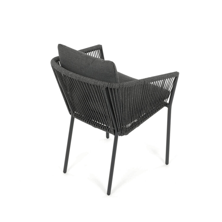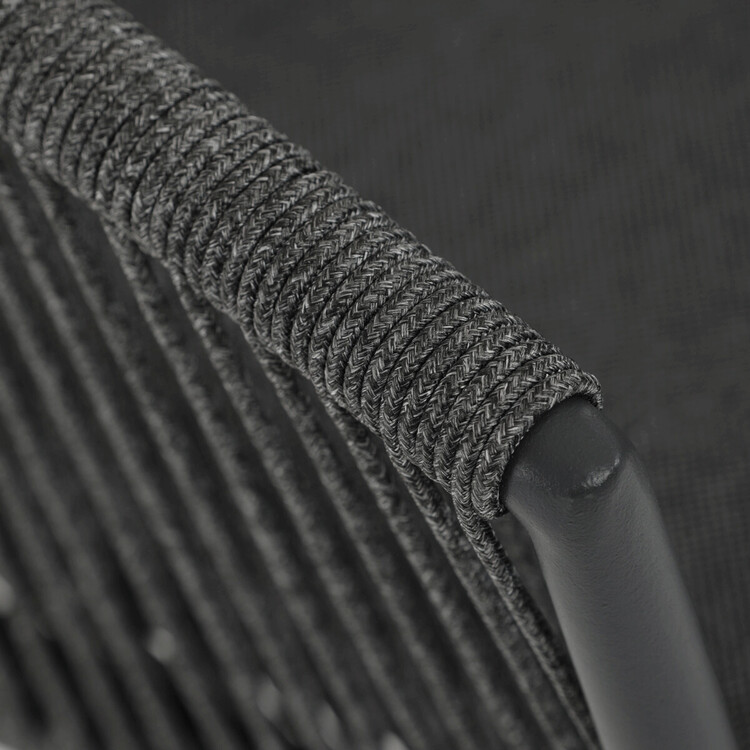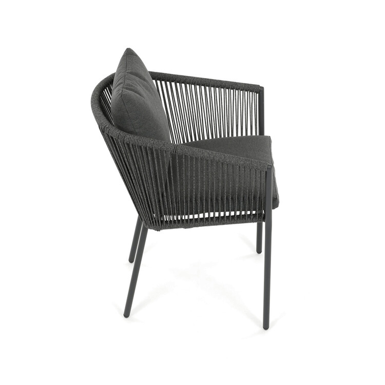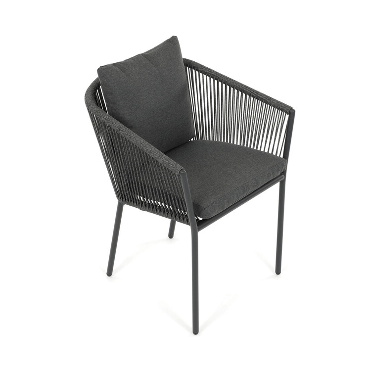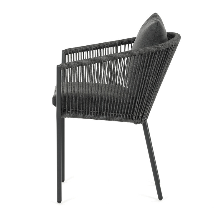 Zahradní židle s pevnou hliníkovou konstrukcí v šedém odstínu nabízí stabilitu a dlouhou životnost i při venkovním použití. Opěradlo a sedák jsou čalouněné rychleschnoucí šedou látkou, která je voděodolná a snadno se udržuje, což zajišťuje komfort i v proměnlivém počasí. Design židle doplňuje moderní provedení s opletením z odolných vláken, které přispívá k celkové pevnosti a vizuální lehkosti. Díky ergonomickému tvaru opěradla a sedáku poskytuje pohodlné posezení během zahradních posezení. Nosnost židle odpovídá standardním požadavkům pro venkovní nábytek, což ji činí vhodnou pro každodenní užívání.