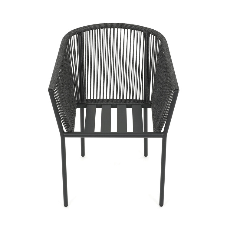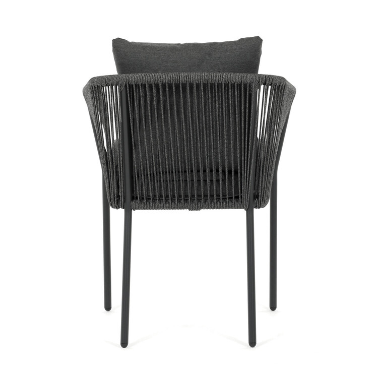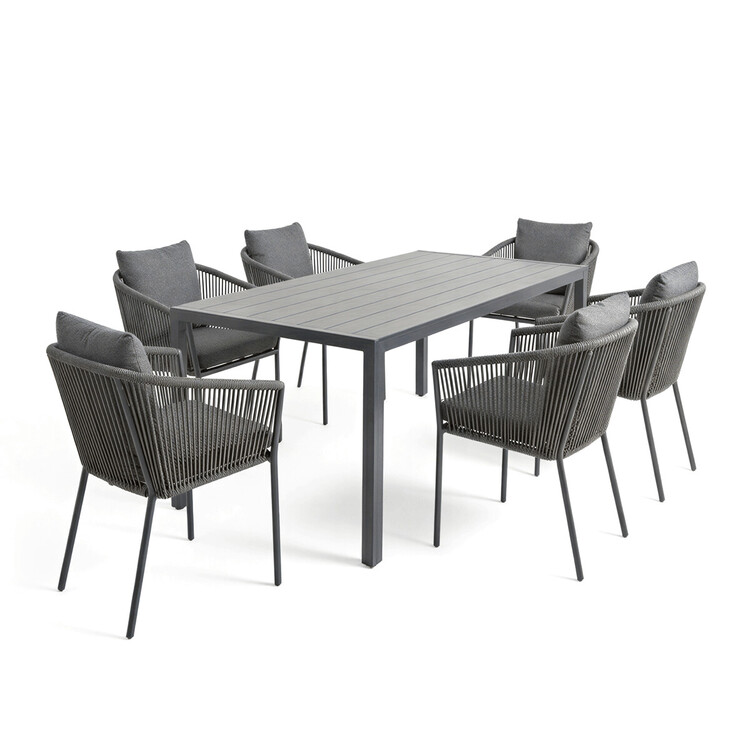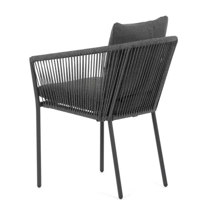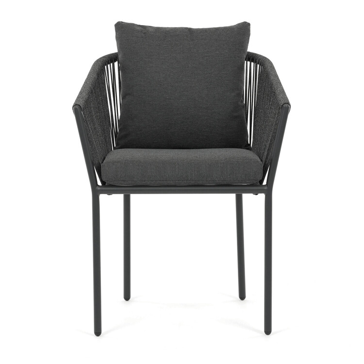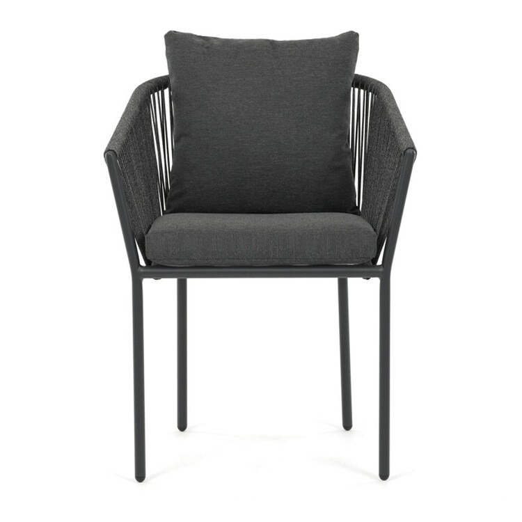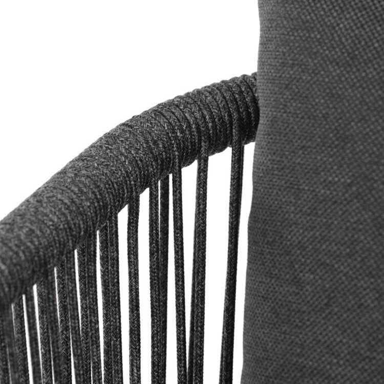 Zahradní židle s pevnou hliníkovou konstrukcí v šedém odstínu nabízí stabilitu a dlouhou životnost i při venkovním použití. Opěradlo a sedák jsou čalouněné rychleschnoucí šedou látkou, která je voděodolná a snadno se udržuje, což zajišťuje komfort i v proměnlivém počasí. Design židle doplňuje moderní provedení s opletením z odolných vláken, které přispívá k celkové pevnosti a vizuální lehkosti. Díky ergonomickému tvaru opěradla a sedáku poskytuje pohodlné posezení během zahradních posezení. Nosnost židle odpovídá standardním požadavkům pro venkovní nábytek, což ji činí vhodnou pro každodenní užívání.