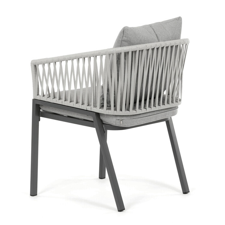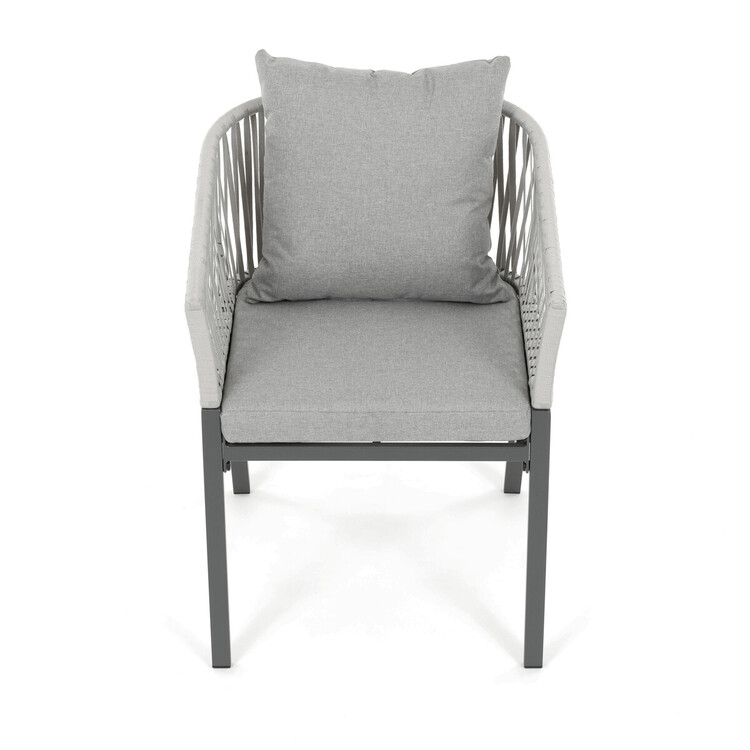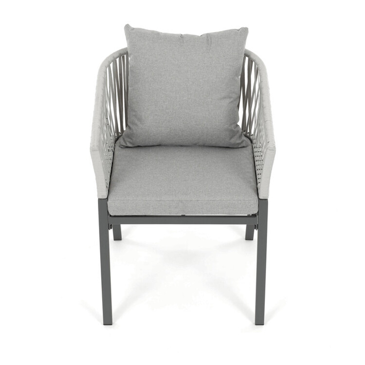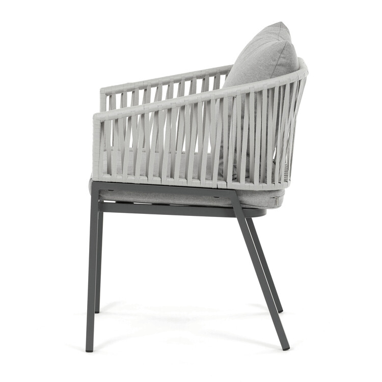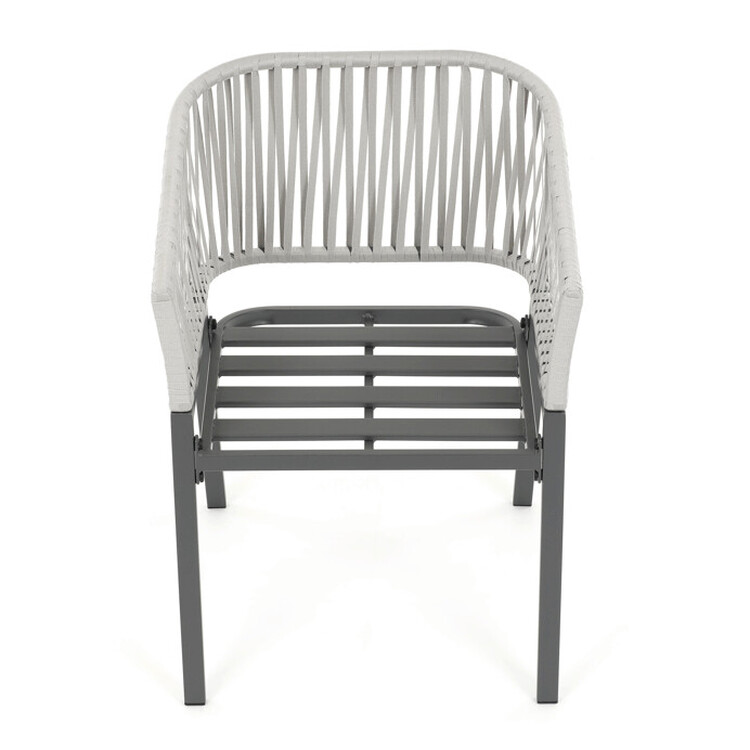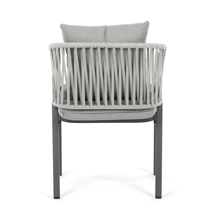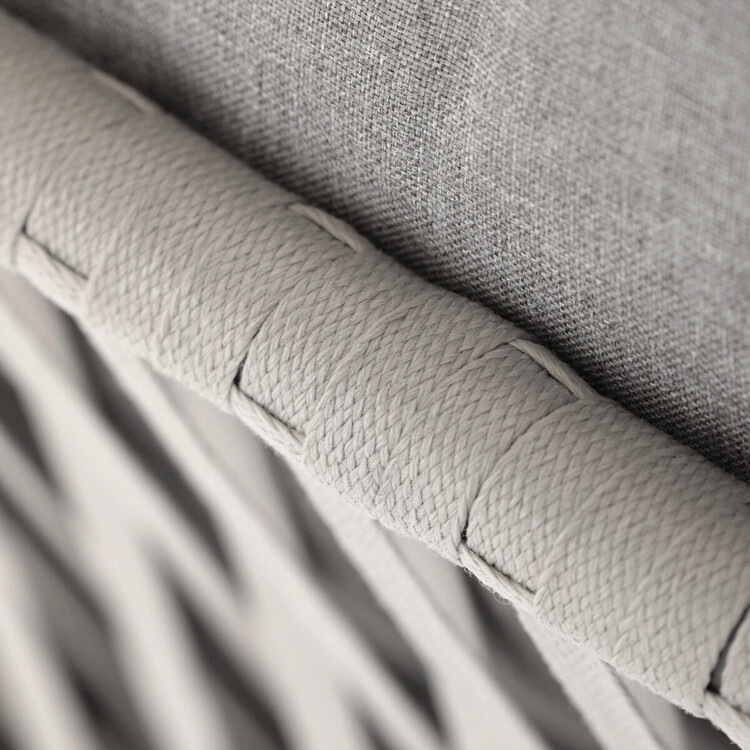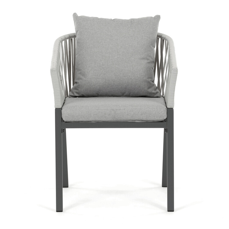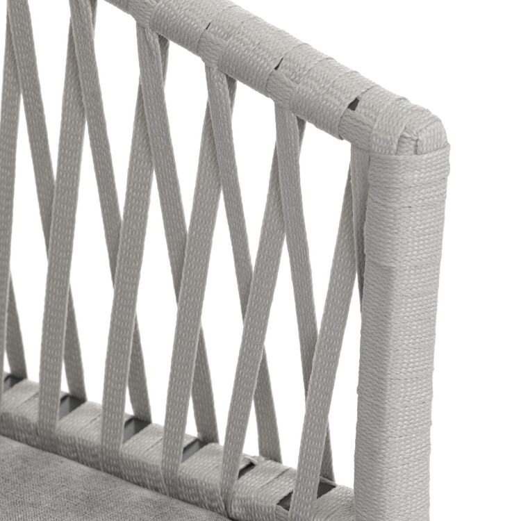 Zahradní židle s pevnou kovovou podnoží v šedém odstínu nabízí stabilitu a dlouhou životnost i při venkovním použití. Sedák a opěradlo jsou čalouněné šedou látkou, která je příjemná na dotek a vhodná pro relaxaci na zahradě či terase. Nadčasový design s jednoduchými liniemi a decentním propletením na opěradle zajišťuje univerzální využití v různých venkovních prostorách. Židle kombinuje komfort s odolností materiálů, což ji předurčuje k pravidelnému užívání v exteriéru. Díky svému provedení je snadná na údržbu a zároveň vizuálně přitažlivá.