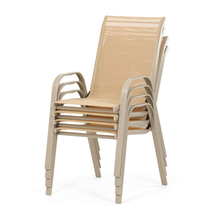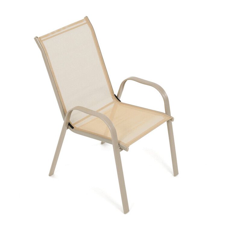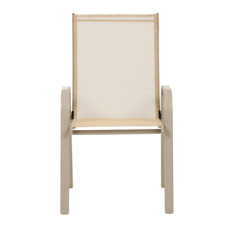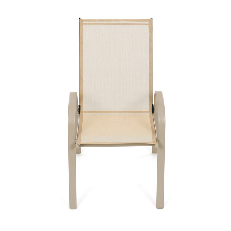 Zahradní židle v krémovém provedení kombinuje pevný kovový rám se sedákem a opěradlem z krémové síťoviny, které zajišťují pohodlné posezení venku. Konstrukce je navržena tak, aby byla stohovatelná, což usnadňuje skladování a manipulaci při sezónním ukládání. Kovová podnož je opatřena práškovým lakem, který chrání proti povětrnostním vlivům a zajišťuje dlouhou životnost. Ergonomický tvar opěradla podporuje správné držení těla během odpočinku. Rozměry a nosnost odpovídají běžným standardům zahradního nábytku, což umožňuje univerzální použití na terasách, balkonech i zahradách.