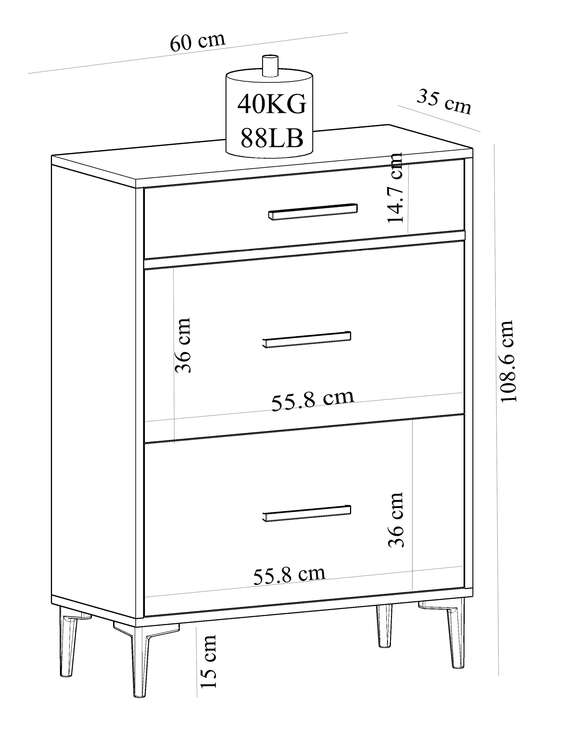 S rozměry 108.6 × 60 × 35 cm skříňka nabízí kompaktní, ale efektivní úložné řešení. Vyrobena z kvalitního LTD materiálu o tloušťce 18 mm, zajišťuje dlouhou životnost a stabilitu. Plastové úchytky a plastové nožičky dodávají moderní vzhled a snadné používání.