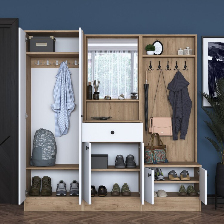 Předsíňová sestava je ideální volbou pro moderní a organizovanou předsíň. Spojení bílé barvy a dekoru ořechu dodává prostoru elegantní a útulný vzhled. Díky praktickému uspořádání a kvalitnímu zpracování splňuje všechny požadavky na funkčnost a estetiku.