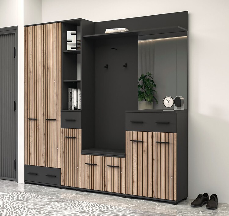 O stylový design Vaší vstupní části se postará moderní předsíňová sestava . Kombinace moderních barev a předních dvířek imitujících trendové lamely jí dodává jedinečný charakter.