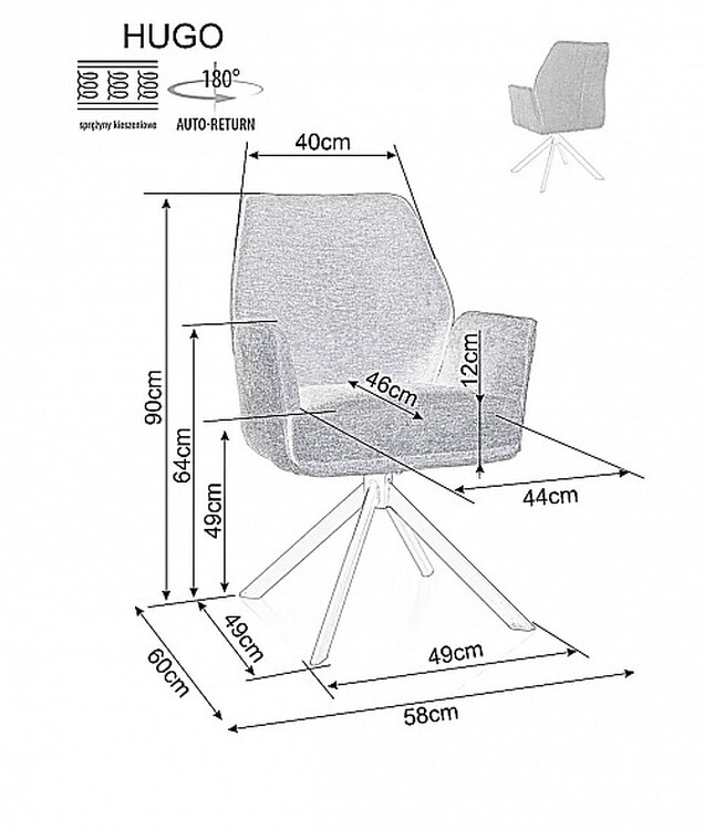 Funkce automatického návratu umožňuje otočení sedačky o 180 stupňůa návrat do původní polohy, což přidává na praktičnosti a zjednodušujemanipulaci. S rozměry 58 cm na šířku, 90 cm na výšku a 60 cm nahloubku je tato židle ideální pro jídelny, pracovny nebo jiné prostory.