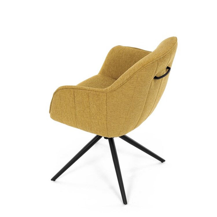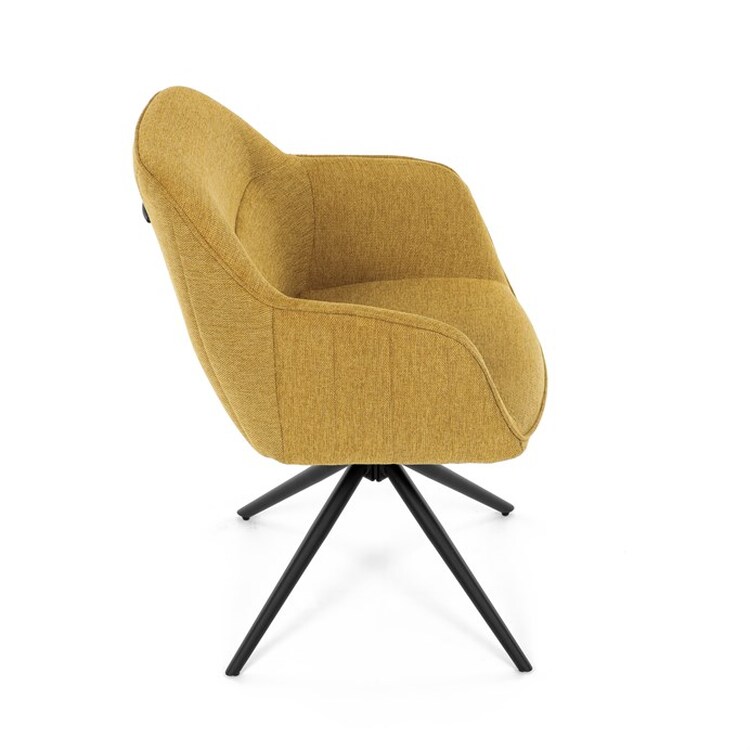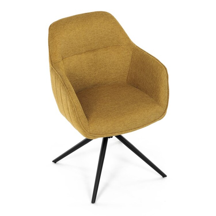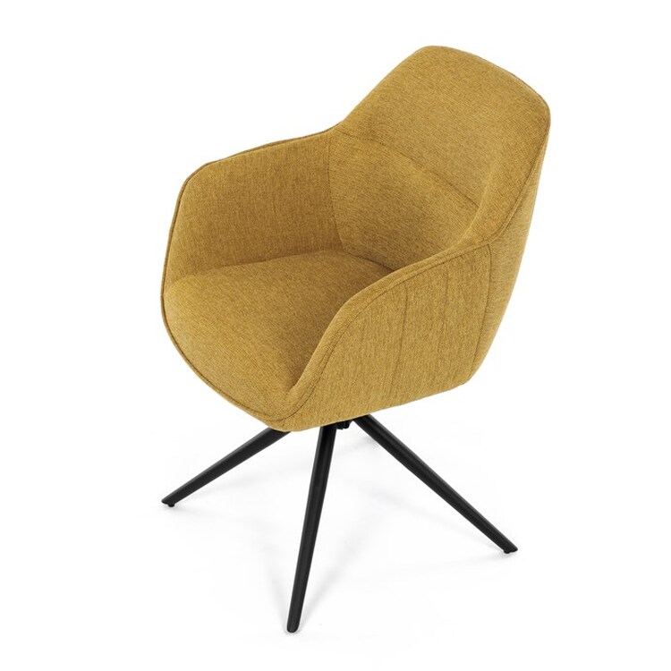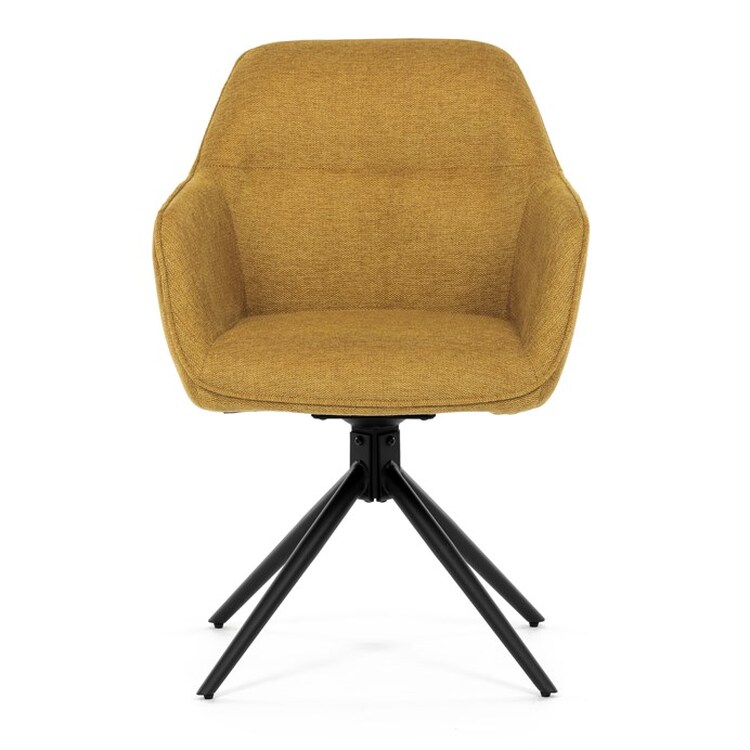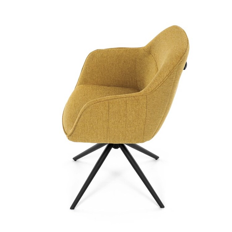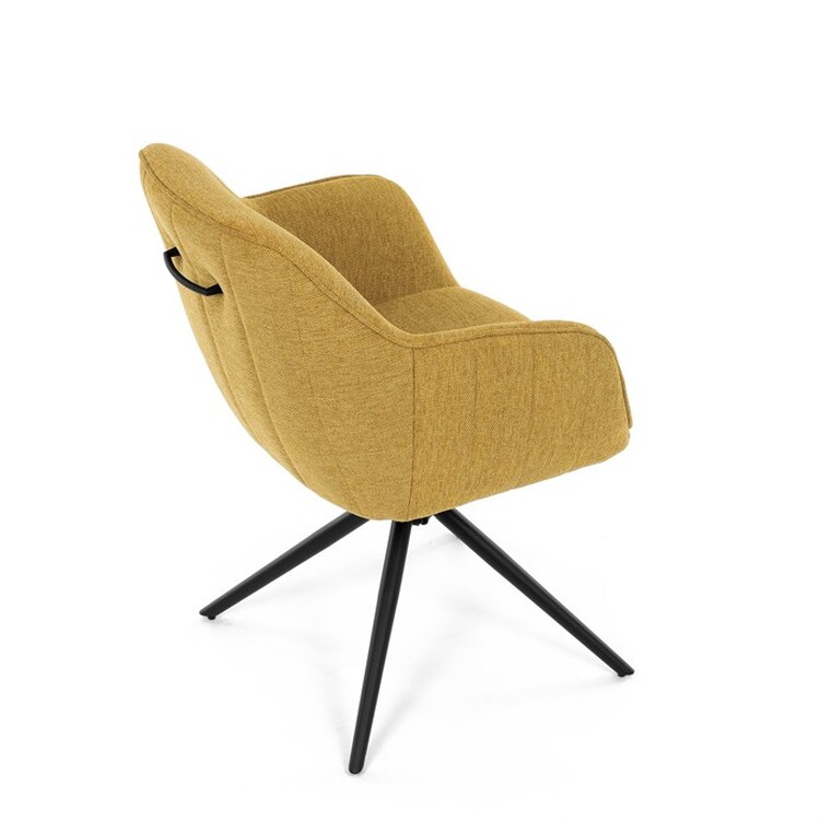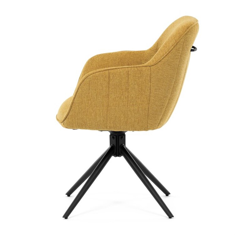 Moderní jídelní židle ve žluté barvě s efektním prošitím zádové i přední části opěráku. Prošití je v brvě potahového materiálu. Zadní část opěráku je opatřena vkusným madlem pro snazší manipulaci. Čtyři kovové nohy v matném práškovém nástřiku vycházejí z centrálního bodu ve středu sedáku. Sedák je otočný o P90°+ L 90° s vratným mechanismem – funkce reset.