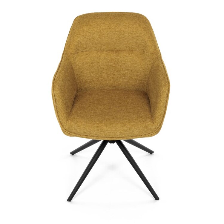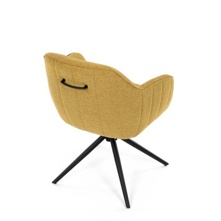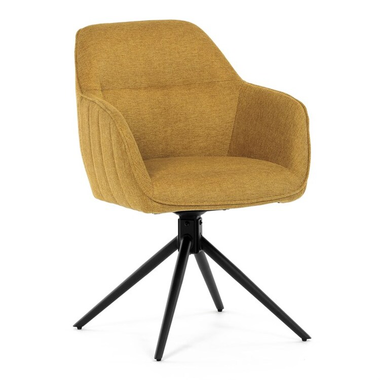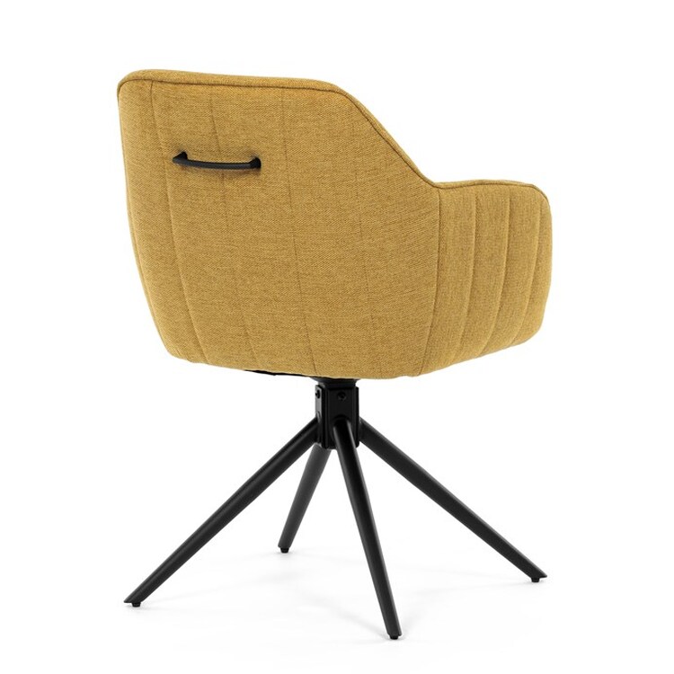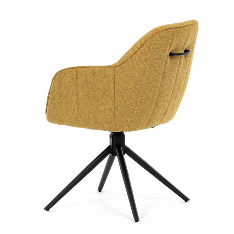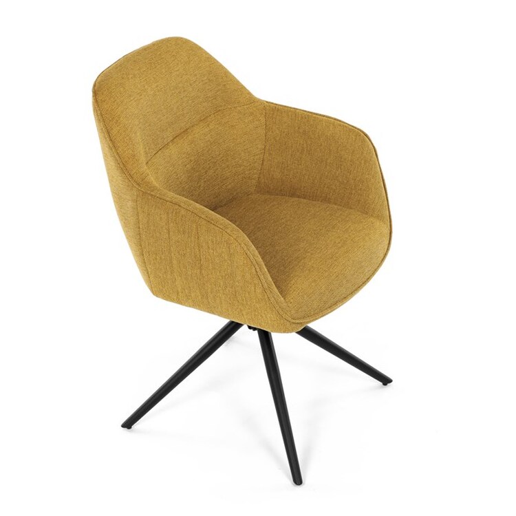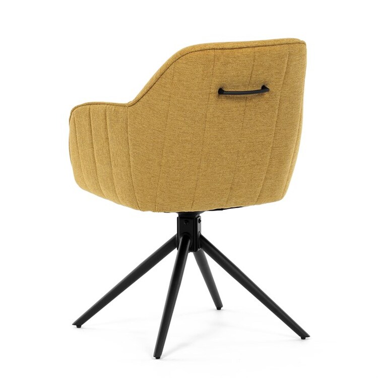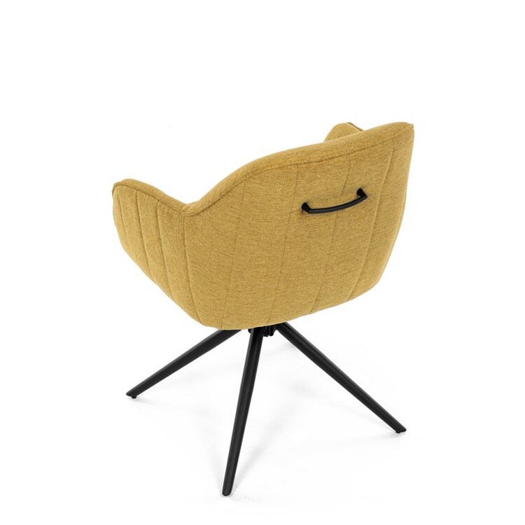 Moderní jídelní židle ve žluté barvě s efektním prošitím zádové i přední části opěráku. Prošití je v brvě potahového materiálu. Zadní část opěráku je opatřena vkusným madlem pro snazší manipulaci. Čtyři kovové nohy v matném práškovém nástřiku vycházejí z centrálního bodu ve středu sedáku. Sedák je otočný o P90°+ L 90° s vratným mechanismem – funkce reset.
