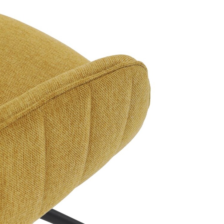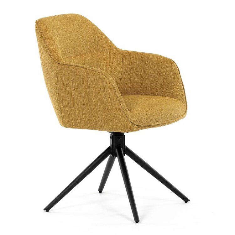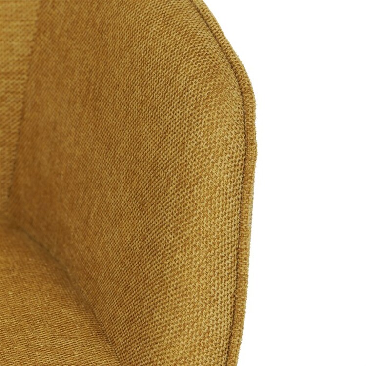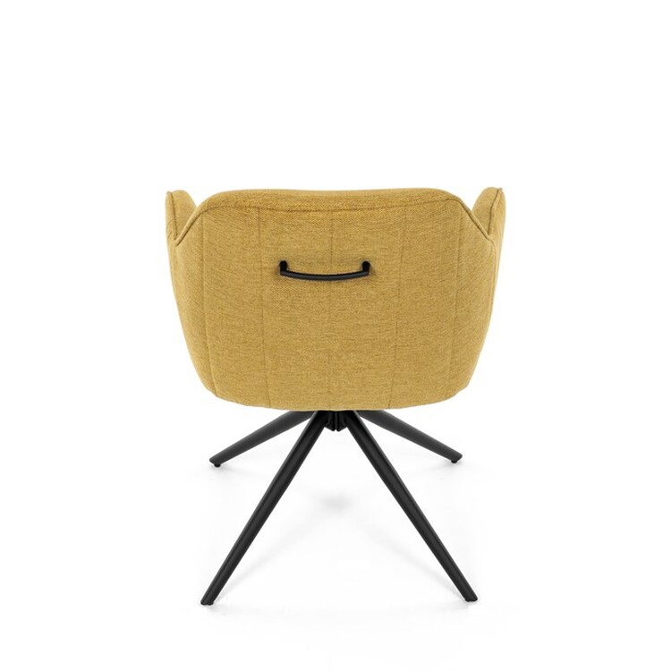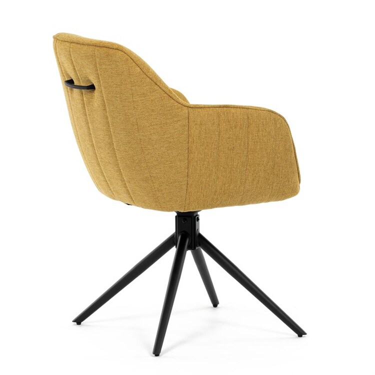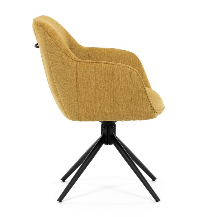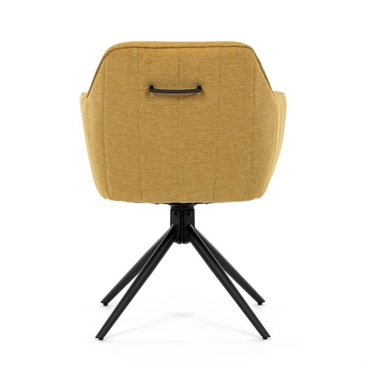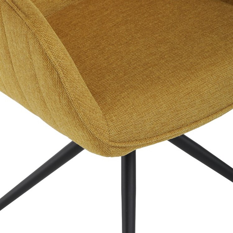 Moderní jídelní židle ve žluté barvě s efektním prošitím zádové i přední části opěráku. Prošití je v brvě potahového materiálu. Zadní část opěráku je opatřena vkusným madlem pro snazší manipulaci. Čtyři kovové nohy v matném práškovém nástřiku vycházejí z centrálního bodu ve středu sedáku. Sedák je otočný o P90°+ L 90° s vratným mechanismem – funkce reset.