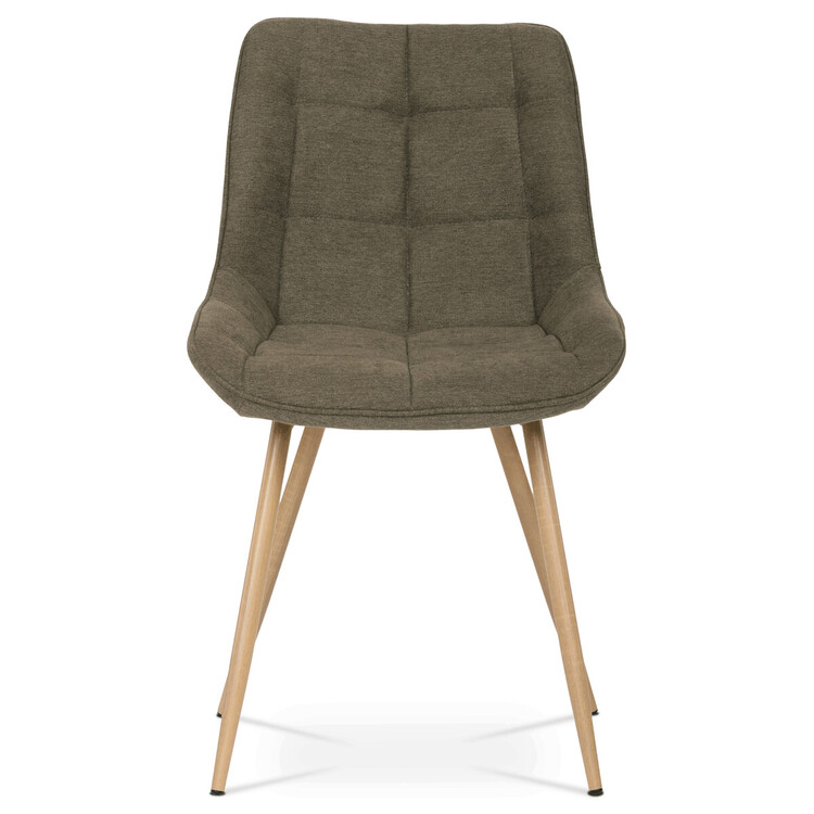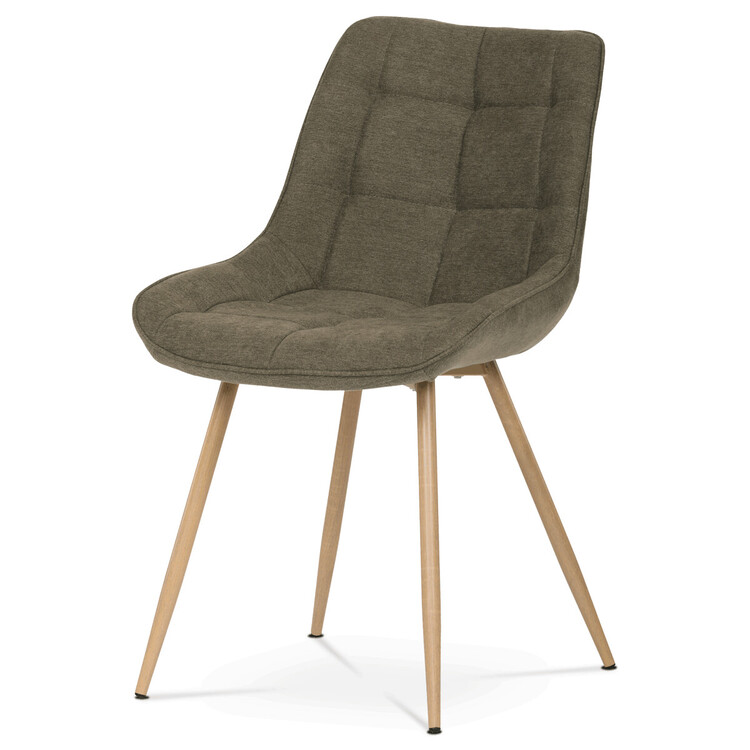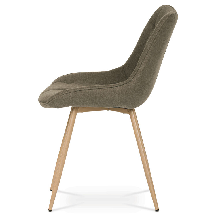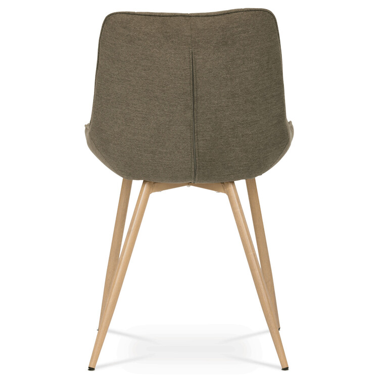 Designová skořepinová jídelní židle je čalouněna hnědou látkou s výrazným prošitím sedací části i části určené k opření. Sedací část je zaoblená a má vyvýšené boky, plynule přecházející do opěráku. Polstrování je z kvalitní PU pěny. Čtyřnohá kovová podnož je v 3D dekoru dub. Nohy jsou kruhového průřezu a kónické, ukončené černými platovými kluzáky. Celá podnož je svařená a dodávána jako celek, nehrozí tedy občasné dotahování šroubů jako u podnože šroubované.Toto vše působí nejen jako stylový designový prvek, ale dělá židli velmi pevnou, pohodlnou a praktickou na kratší i delší posezení. Svým provedením ve Skandinávském stylu a decentní barevností se židle hodí nejen k jídelnímu stolu, ale i jako součást pracoven či konferenčních místností.