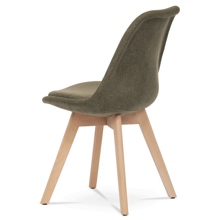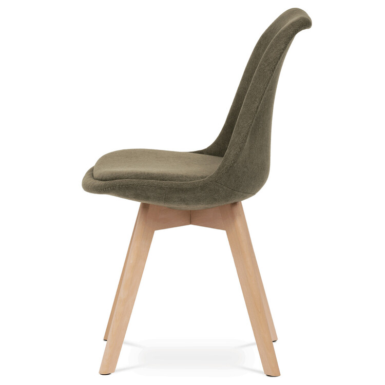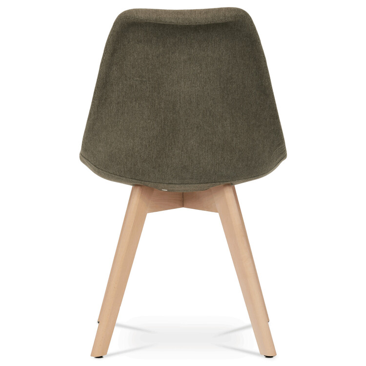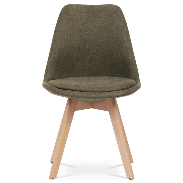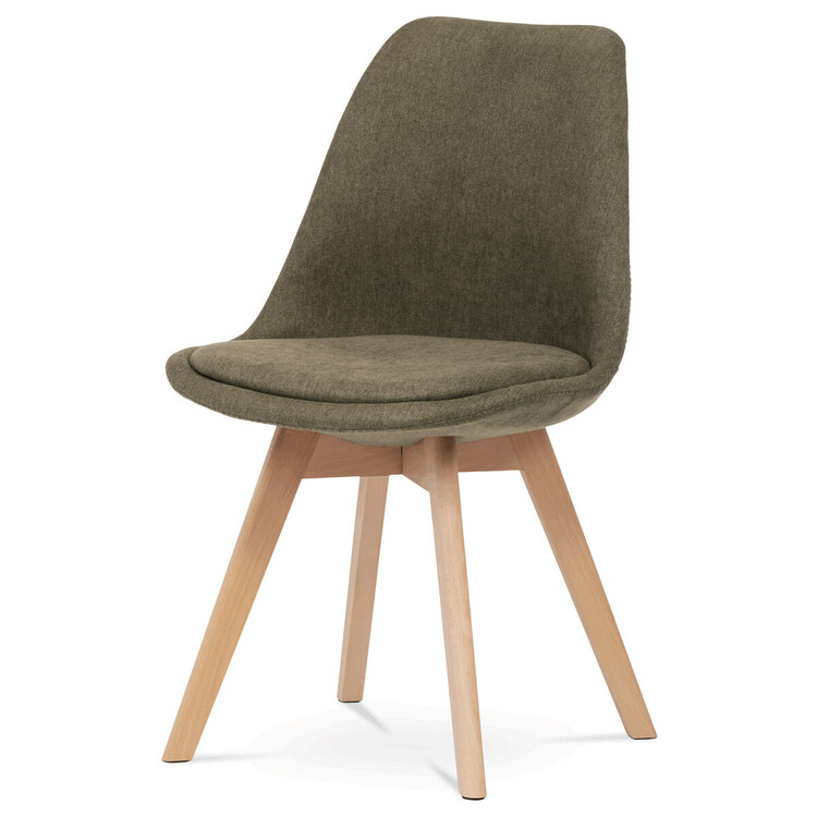 Jídelní židle s tvarovaným čalouněným korpusem v hnědé barvě, vybavená pohodlným polstrovaným sedákem, který ladí s opěrkou. Nohy jsou vyrobeny z bukového masivu v přírodním odstínu, dodávající židli stabilitu a estetický kontrast. Židle je navržena s ohledem na pohodlí i styl, což ji činí ideální volbou pro moderní interiéry. Plastové kluzáky na nohách zajišťují ochranu podlahové krytiny před poškozením. Díky svému elegantnímu skandinávskému designu je vhodná do kuchyní, pracoven i obývacích pokojů.