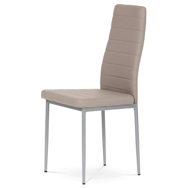 Tato jídelní židle je dokonalým přídavkem do vaší moderně zařízené kuchyně či jídelny.Prémiová lanýžová eko kůže dotváří exkluzivní vzhled a zároveň zajišťuje pohodlí při každodenním posezení. Ekologická kůže je snadno udržovatelná a odolná vůči poškrábání, což ji činí ideální volbou pro rodiny s dětmi nebo domácnosti s mazlíčky.Šedé kovové nohy dodávají židli elegantní vzhled a zajišťují stabilitu na jakém koliv povrchu.Nosnost jídelní židle činí 120 kg.