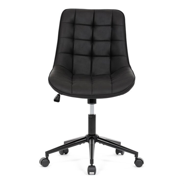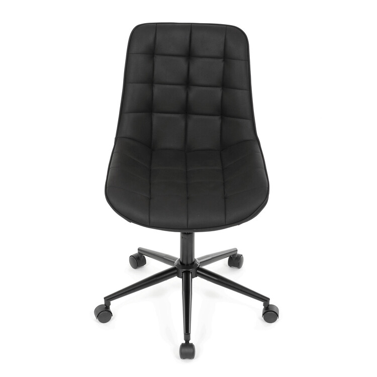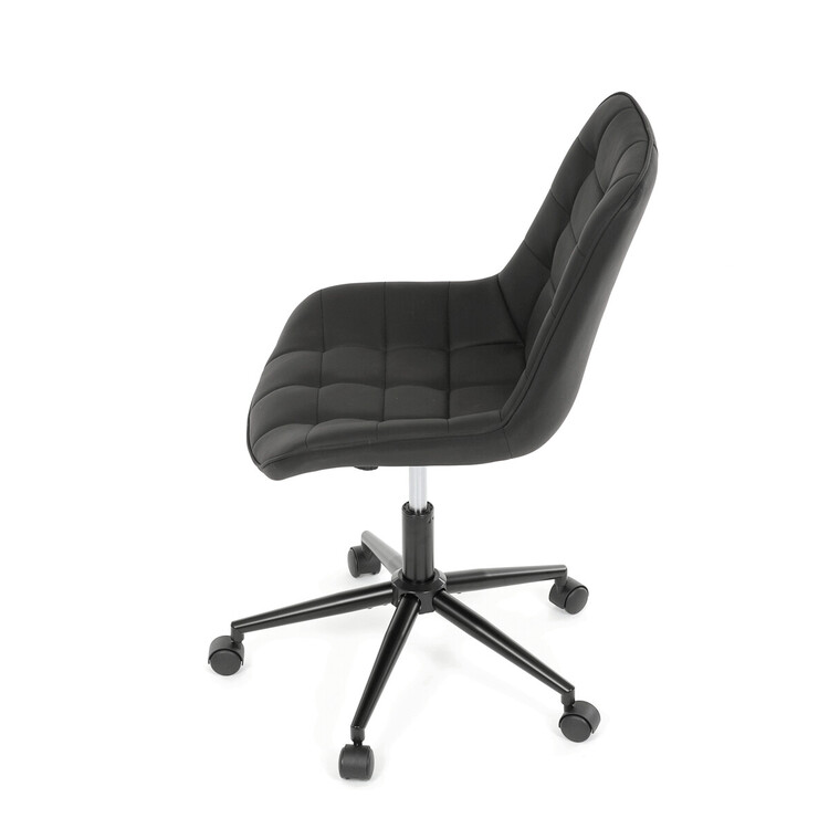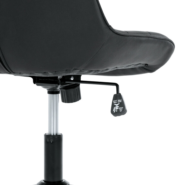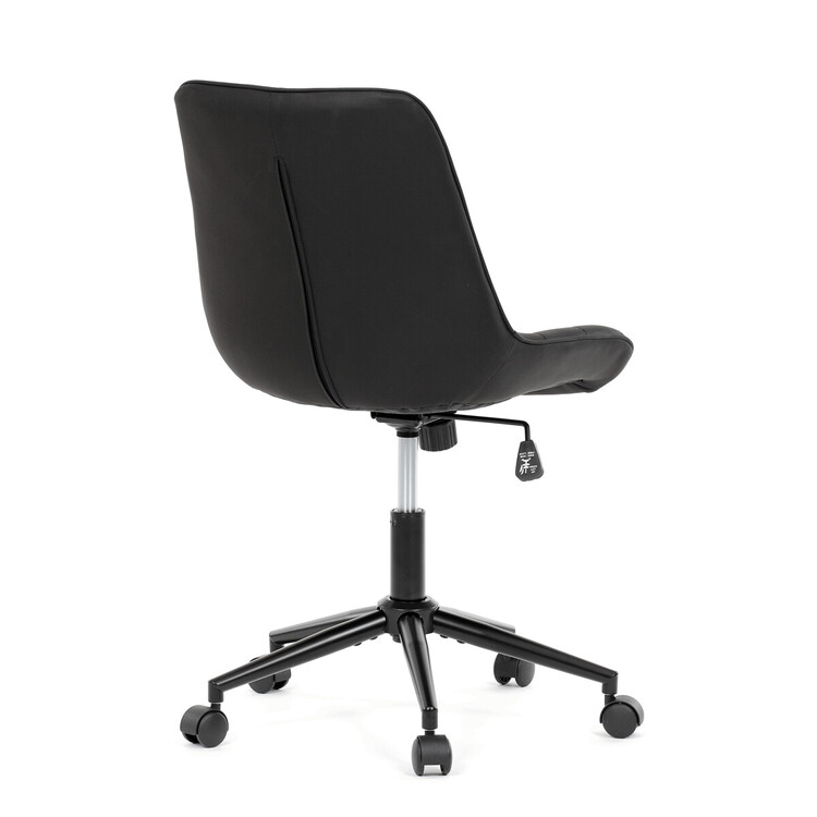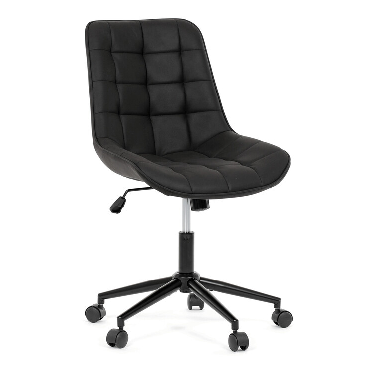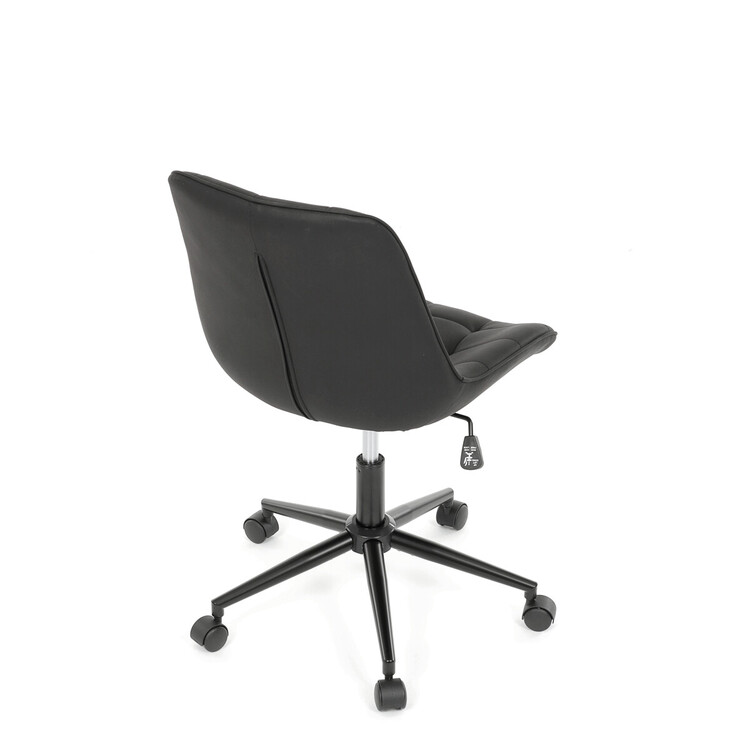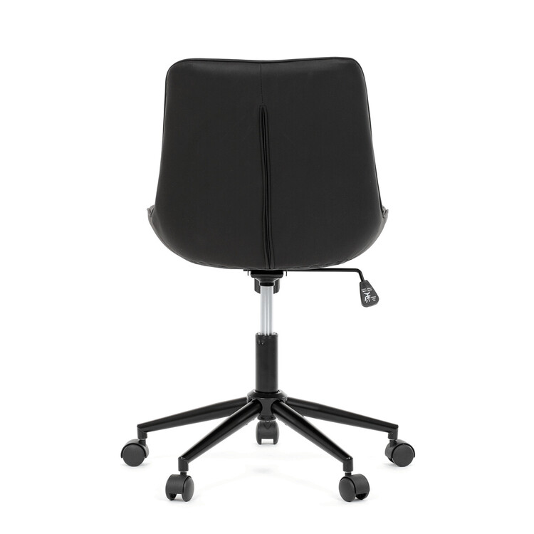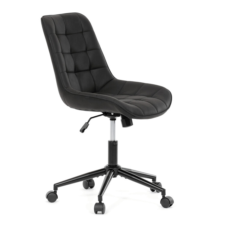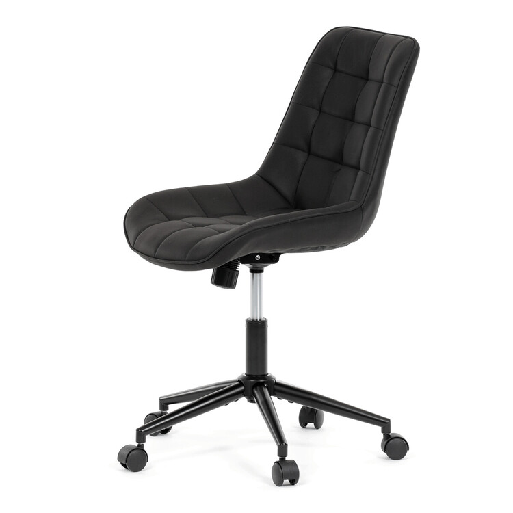 Kancelářská židle s černým potahem v dekoru broušené kůže nabízí moderní vzhled a komfortní sezení. Sedák i opěradlo jsou čalouněné kvalitní látkou, která je příjemná na dotek a snadno se udržuje. Pevný kovový kříž zajišťuje stabilitu a odolnost, zatímco houpací mechanika umožňuje plynulé naklápění pro uvolnění během práce. Výškově nastavitelná sedací plocha umožňuje přizpůsobení výšky podle individuálních potřeb uživatele. Absence područek a bederní opěrky podtrhuje minimalistický design vhodný do různých pracovních prostor.