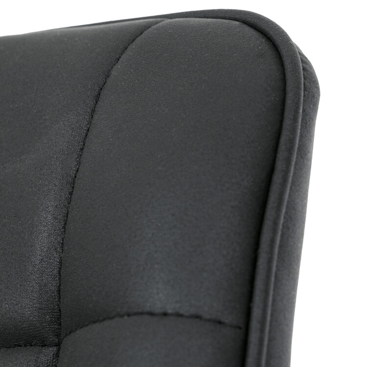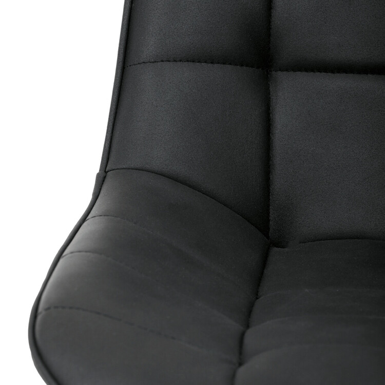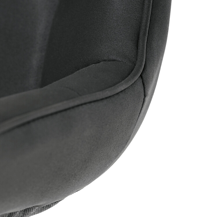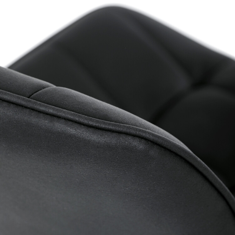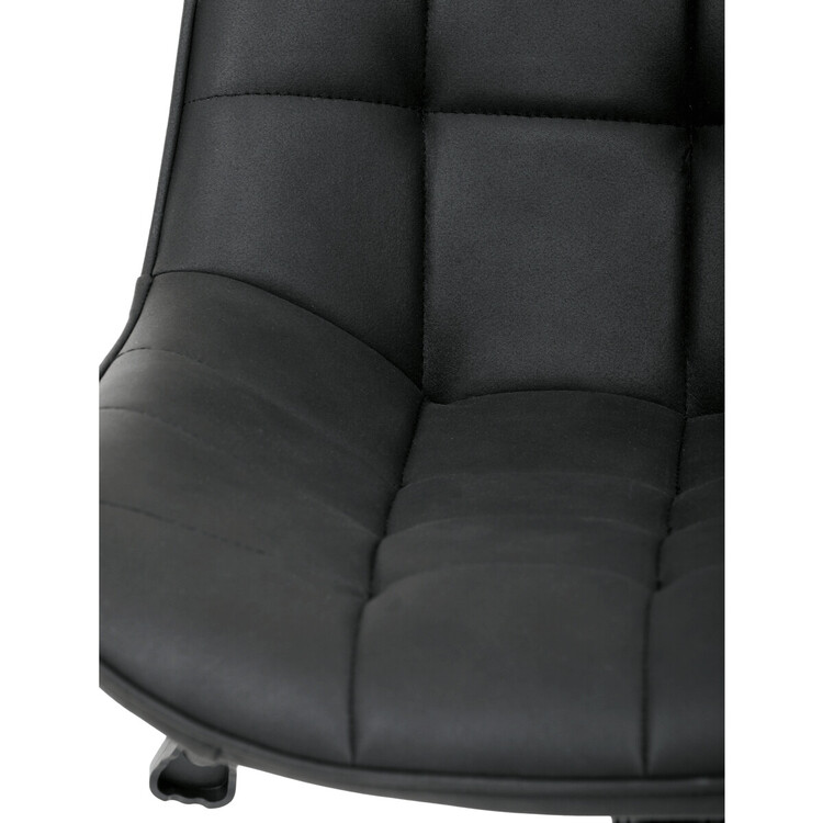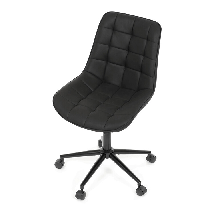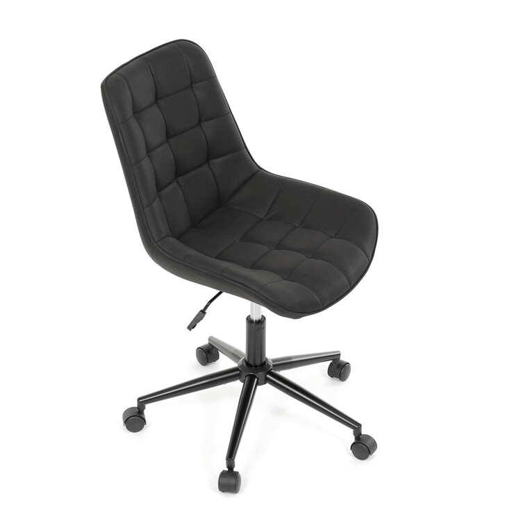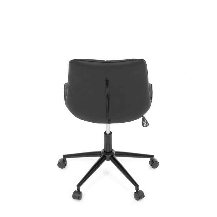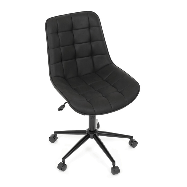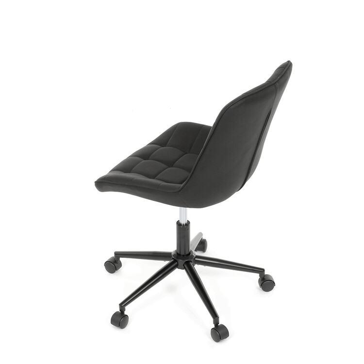 Kancelářská židle s černým potahem v dekoru broušené kůže nabízí moderní vzhled a komfortní sezení. Sedák i opěradlo jsou čalouněné kvalitní látkou, která je příjemná na dotek a snadno se udržuje. Pevný kovový kříž zajišťuje stabilitu a odolnost, zatímco houpací mechanika umožňuje plynulé naklápění pro uvolnění během práce. Výškově nastavitelná sedací plocha umožňuje přizpůsobení výšky podle individuálních potřeb uživatele. Absence područek a bederní opěrky podtrhuje minimalistický design vhodný do různých pracovních prostor.