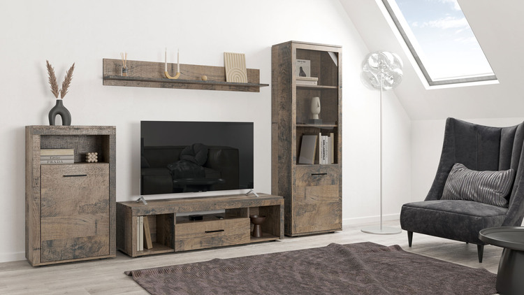 Obývací stěna vás zaujme svým netradičním barevným provedením v barvě dub grunge colonial, která dodá vašemu interiéru hřejivý pocit domova. Obývací pokoj je vyroben z 16 mm laminované desky, která je známá svou odolností a dlouhou životností. Obývací stěna nabízí dostatek úložného prostoru.