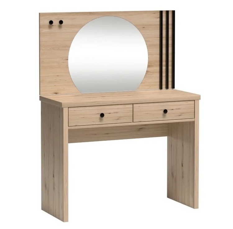 Zrcadlo s panelem vhodné k toaletnímu stolku s netradičním provedením detailu s lamelami. Kolekce nábytku v sobě spojuje jednoduchost, originální vzhled a funkčnost. Barevné provedení je v kombinaci dub artisan/černá mat. Nábytek je vyroben z kvalitního lamina ohraničeného ABS páskou, dekorační lamely jsou vyrobeny z desky MDF. Kolekce se skládá z mnoha prvků a tento široký výběr Vám zaručí sestavit si nábytek podle svých vlastních představ a přání. Dodáváme v demontovaném stavu.