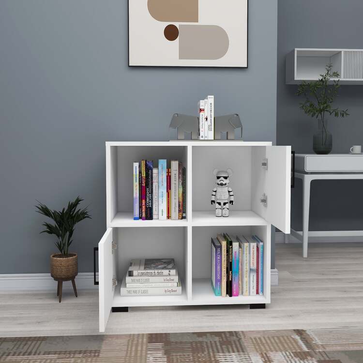 Knihovna je ideálním řešením pro každého, kdo hledá kombinaci funkčnosti a moderního designu. Díky svým kompaktním rozměrům a vybavení plnými dvířky je perfektní pro uspořádání knih, dekorací nebo jiných drobností, které chcete mít na dosah ruky a zároveň chránit před prachem.